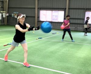今週のテーマ練習の時間は、カラーゴムボールを2人組で投げ合いながら身体の使い方の確認を