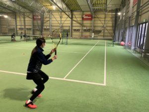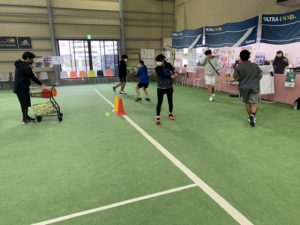 コーチのボールを打ち返すのが精一杯で一生懸命動いてました。