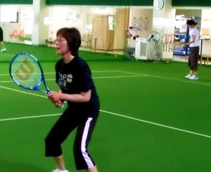 今日のレッスンは、ネット際でノーバウンドで打つボレーの準備の練習をしました。
