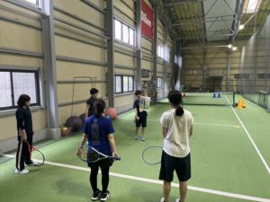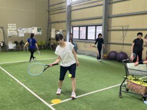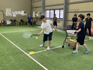 後半はラケット面に手のひらを合わせる感覚練習から、段階的にスイングへ。