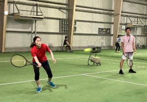 今週のレッスンでは、ダブルスで2人がボレーで1面を守る練習をしました。