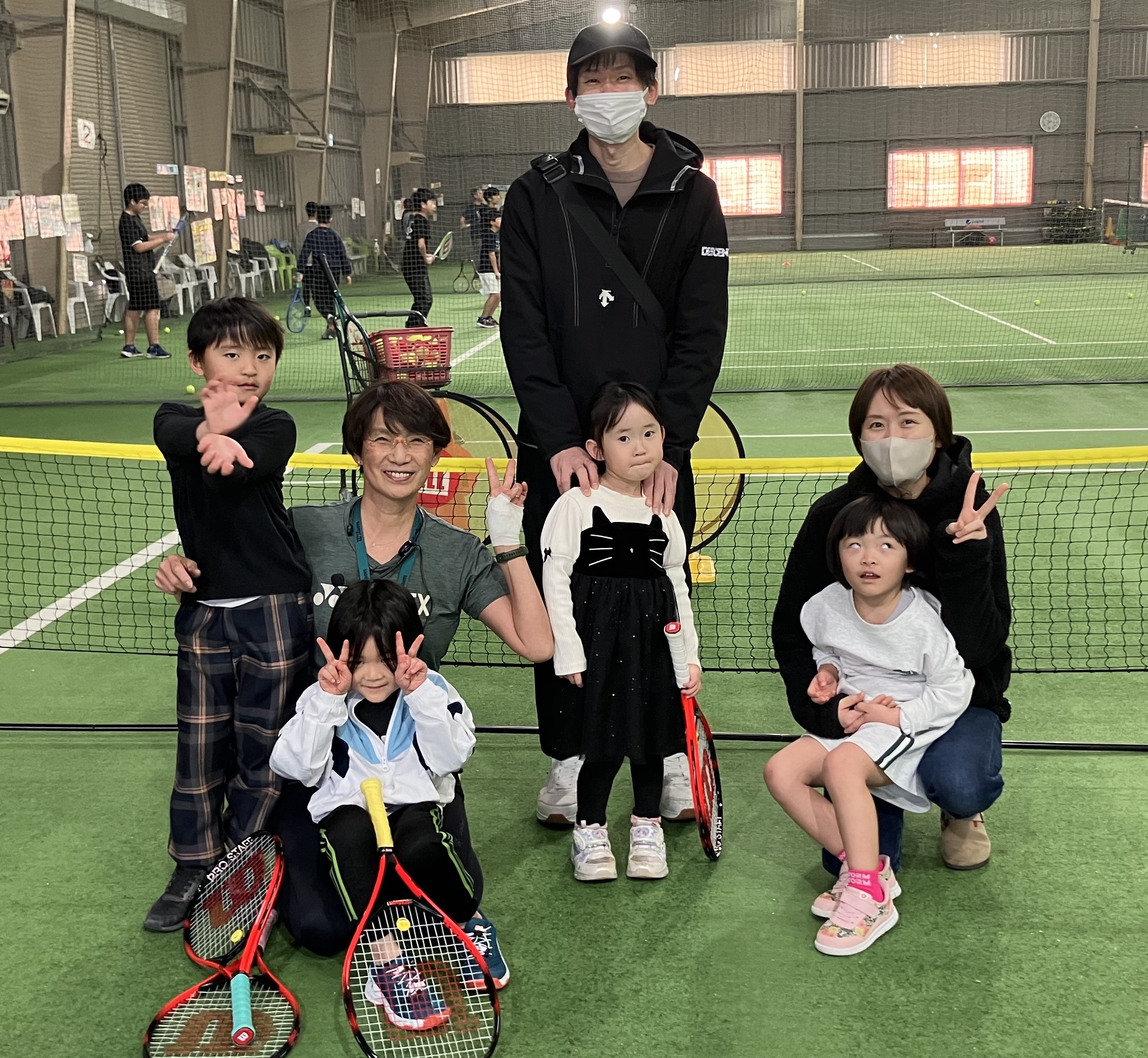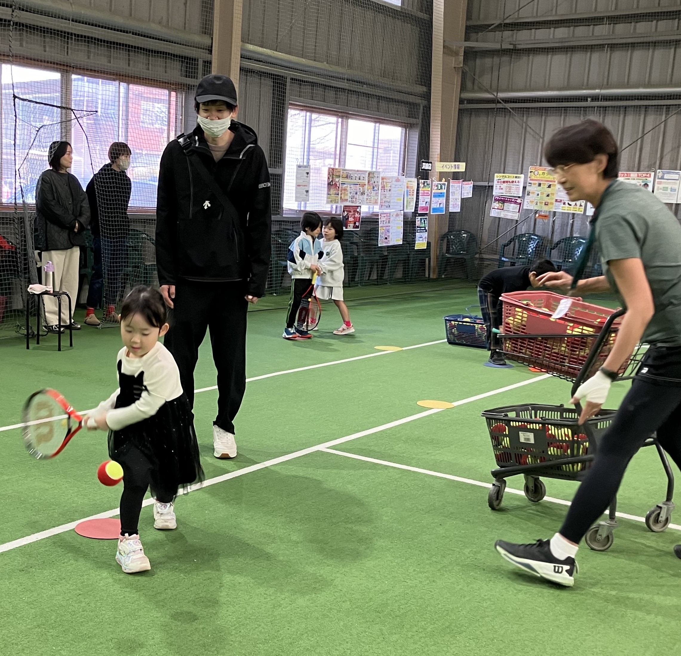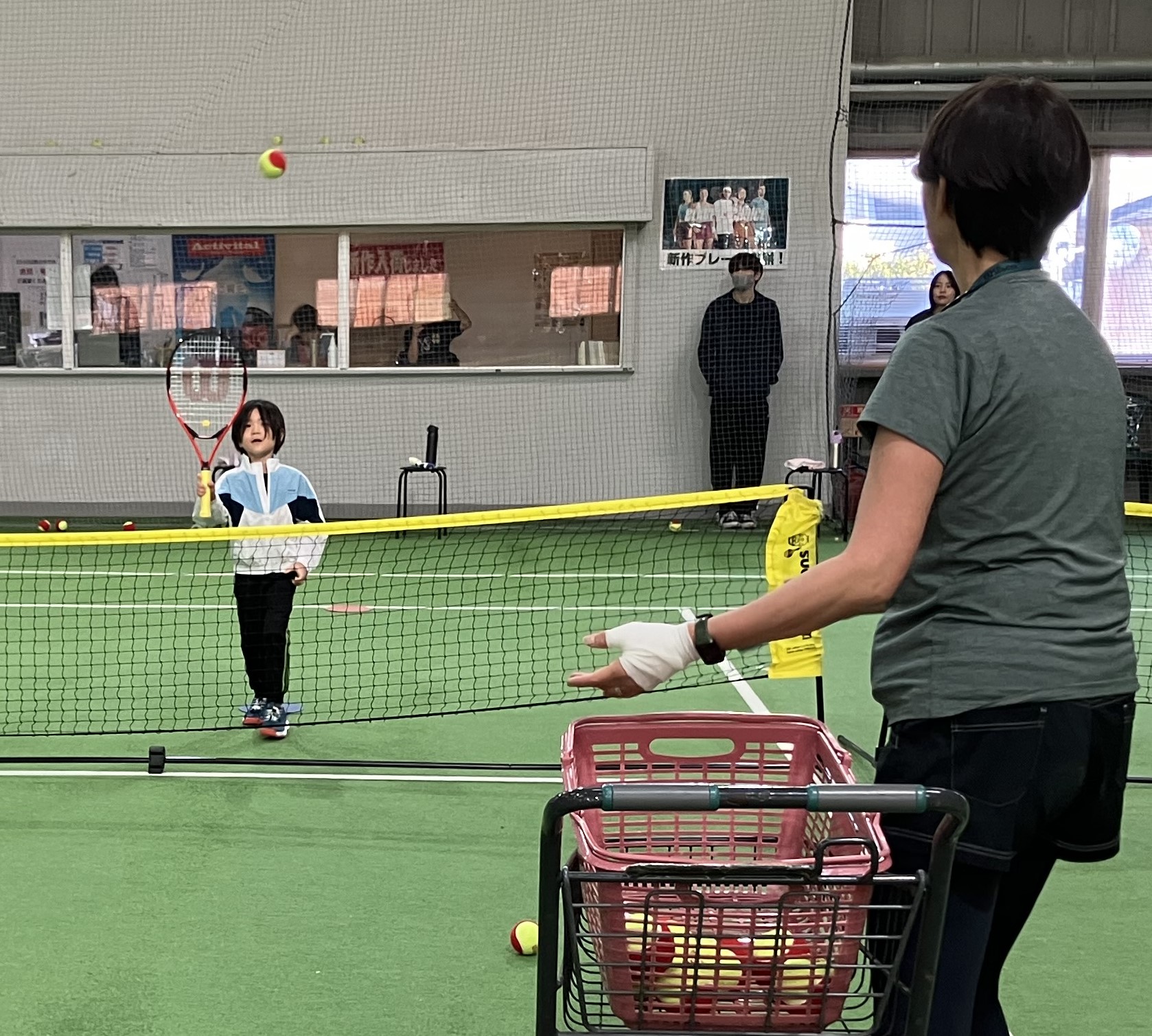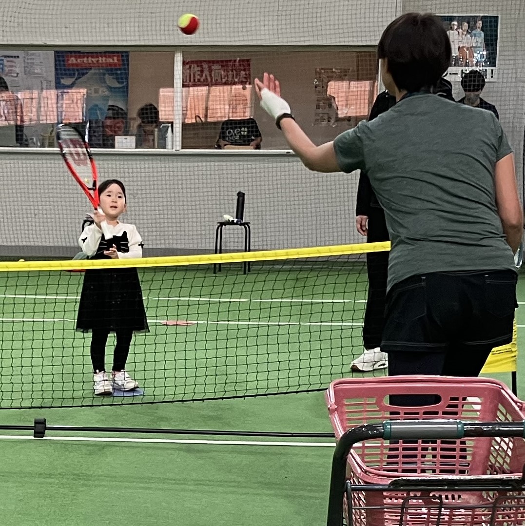 顔の前にラケット面をつくりラケット面の真ん中に当てて返す練習でした。・ノーバウンドのボールを返す練習
