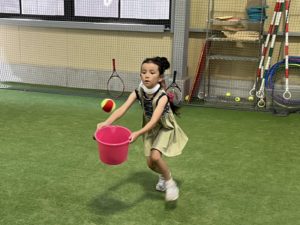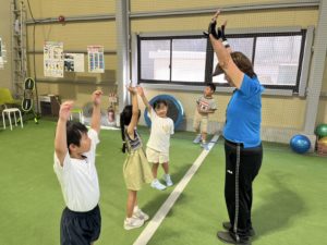 幼稚園クラスでは、レッスンの前半は運動能力アップを目的としたトレーニングが中心。